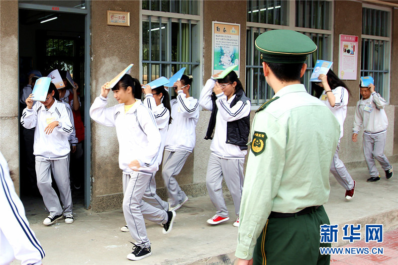 官兵组织学生进行紧急疏散演练