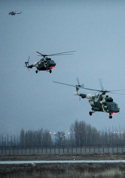 新疆军区某陆航旅进行编队起飞。