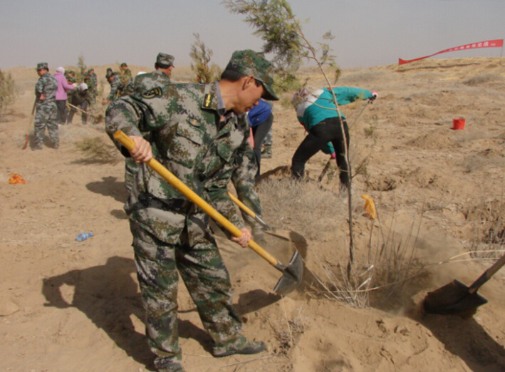 甘肃省民勤县人武部同驻地人民群众一起参加压沙治沙行动。