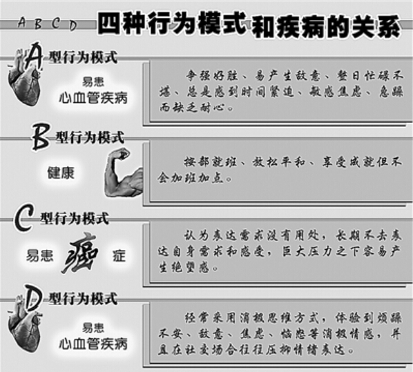 A型行为模式。心理学把人的行为特点分为A、B、C、D四种主要类型,它们跟人的患病风险密切相关(见左下表)。其中A型行为模式者具有争强好胜、时间紧迫感、急躁和敌意四大特征。他们自我实现的需要强烈,整日忙碌不堪,动作快而缺乏耐心,对于排队、堵车这类事易发火、好争吵。当遇到压力时,A型行为模式者体内应激激素分泌更多、血压更高、脉搏更快,这种效应长期累积就会对躯体造成损害。研究发现,当今社会A型行为模式人群有所上升,而且冠心病患者中有70.9%的人都具有A型行为特征。