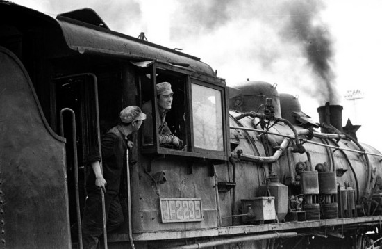 1981年,在北京的永定门火车站,一辆蒸汽火车上的司机们在进行交谈。