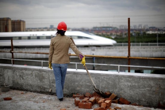 在上海的郊区,一位女建筑工人注视着一辆列车通过连接着上海和杭州的新高速铁路。