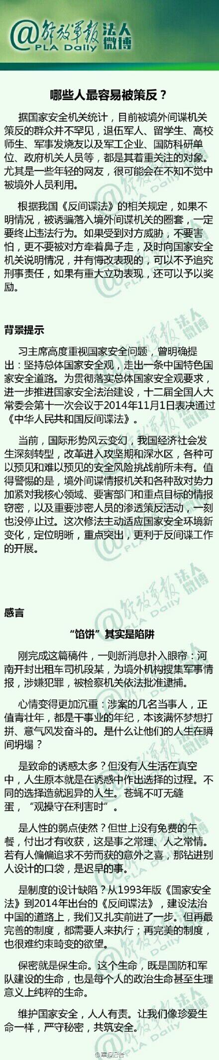 据国家安全机关统计,目前被境外间谍机关策反的群众并不罕见,退伍军人、留学生、高校师生、军事发烧友以及军工企业、国防科研单位、政府机关人员等,都是其着重关注的对象。尤其是一些年轻的网友,很可能会在不知不觉中被境外人员利用。