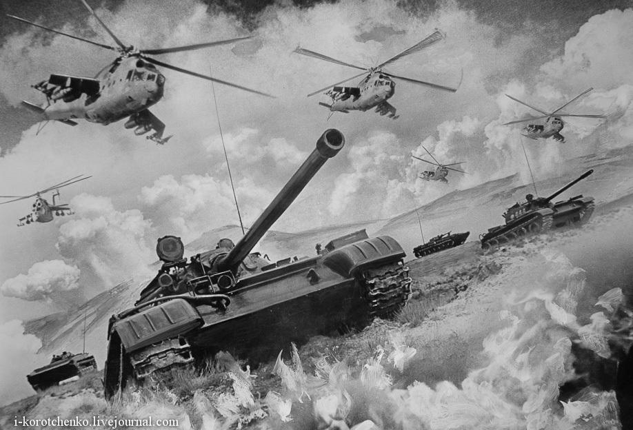 曾经强大的苏军一直北约的噩梦。那铺天盖的战机坦克群曾被视为“无敌”的象征。如今,强大的苏联早已不复存在。我们也只能从老照片中再重温苏军的辉煌时刻。本图集为俄罗斯方面修复的前苏联军队铅绘,震撼场景仿佛就在昨天。图为米-24武直配合装甲部队空地协同推进。