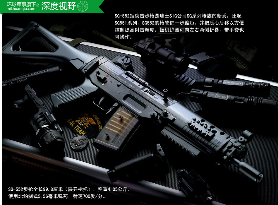 SG-552短突击步枪是瑞士SIG公司SG系列枪族的新秀,比起SG551系列,SG552的枪管进一步缩短,并把质心后移以方便控制提高射击精度。扳机护圈可向左右两侧折叠,带手套也可操作。