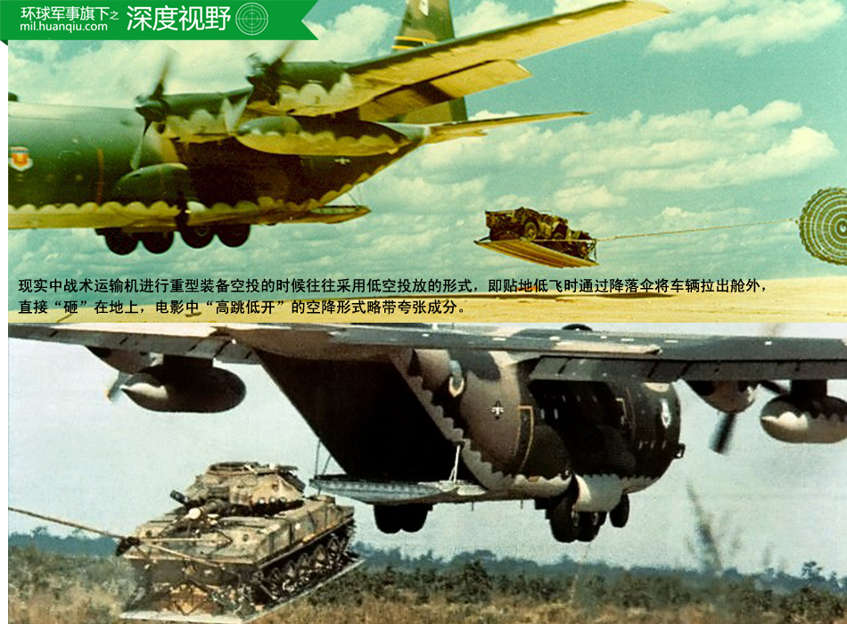 现实中战术运输机进行重型装备空投的时候往往采用低空投放的形式,即贴地低飞时通过降落伞将车辆拉出舱外,直接“砸”在地上,电影中“高跳低开”的空降形式略带夸张成分。