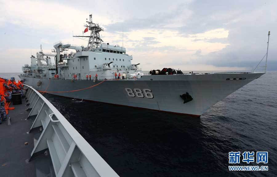 新华网消息:正奔赴亚丁湾、索马里海域执行护航任务的中国海军第二十批护航编队14日上午在马六甲海峡以西海域成功进行了海上液货和副食补给。这是济南舰、益阳舰、千岛湖舰自4月3日从浙江舟山起航以来,首次进行的海上补给。