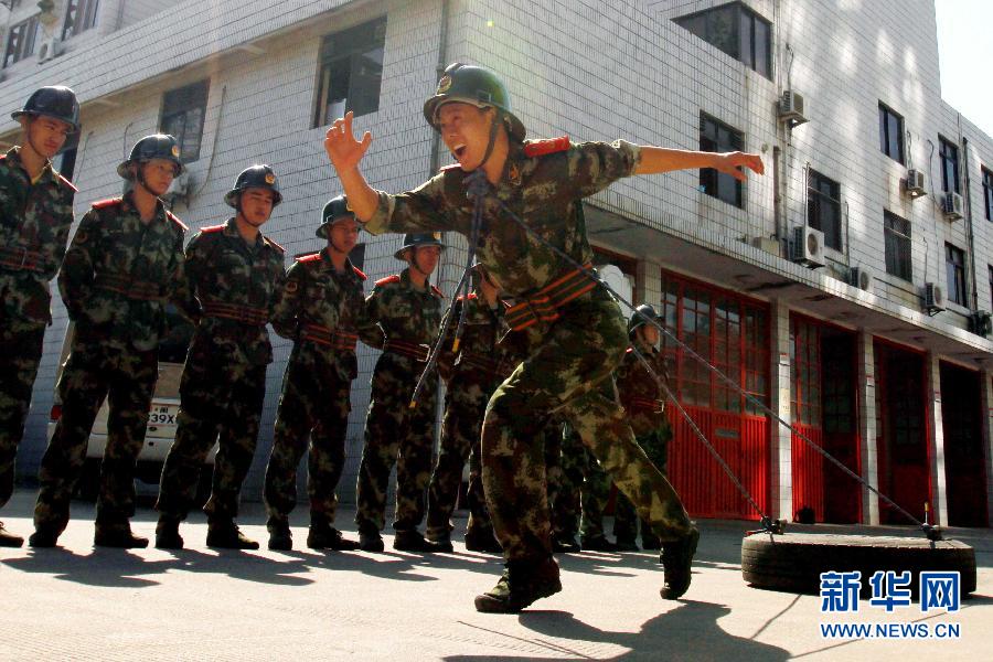 在和平年代,有这样一支队伍,水枪是他们手中的“武器”,云梯是他们肩上的“翅膀”,穿上橙色战衣,踏上红色战车,敢与火魔搏斗,誓与死神周旋。他们,正是新时期最可爱的消防战士。要想成为消防‘铁人’并不容易,需百炼成钢。一名普通的新兵要经过15个月左右的艰苦磨炼,才能逐渐成长为合格的消防战士,而要真正成为消防“铁人”,还需要付出更多的艰辛。他们每天早上6点起床,晚上10点熄灯,训练时间基本在10个小时以上,主要进行单双杠、俯卧撑、仰卧起坐、翻轮胎、负重登楼等一系列高强度的体能训练,还要熟练掌握400米疏散物资救人、高空横渡救人、井下救人、建筑火灾内攻操、车辆事故救援操、石油化工灾害灭火操等各种救援操法。训练场上,消防“铁人”攀爬挂钩梯健步如飞,翻越障碍板轻如飞燕,穿越火龙勇猛直前,高空训练胆大心细。在日常的灭火救援中,消防战士将面临台风、地震、洪灾、爆炸、坍塌、毒气泄漏等各种自然灾害与突发事件,他们运用娴熟的业务技能和顽强拼搏的作风,捍卫着一方平安,成为当之无愧的消防“铁人”。新华社发(曾德猛 摄)