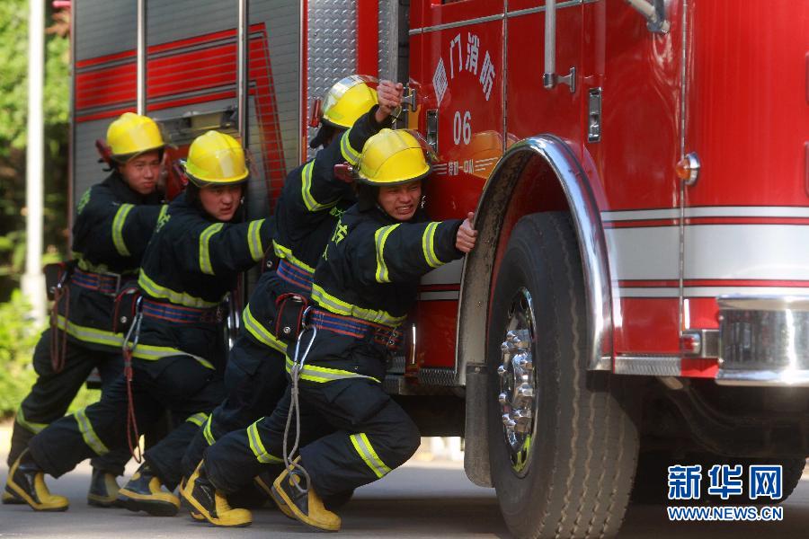 福建省厦门市消防支队特勤一中队官兵进行推消防车耐力训练。曾德猛 摄