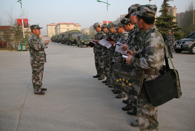 4月16日,兰州军区某防化团政委张贵泉在出发前做动员。高方录 摄