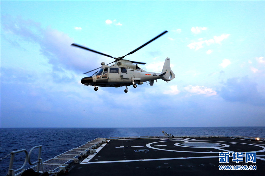 新华网消息:当地时间19日17时,中国海军第二十批护航编队组织济南舰、益阳舰舰载直升机在印度洋某海域进行起航以来首次航行状态下双机跨昼夜飞行训练。