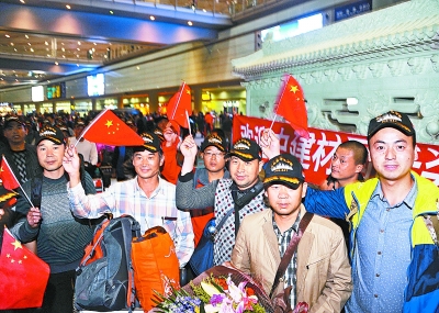 3月31日,首批撤离也门的同胞抵达北京首都国际机场后激动地挥舞国旗。