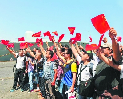 3月29日,首批撤离也门的中国人举着国旗欢呼,迎接来自祖国的军舰。