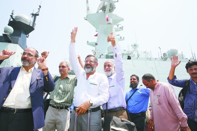 4月2日,在也门亚丁港,外国公民登舰前向中国海军临沂舰舰员表示感谢。