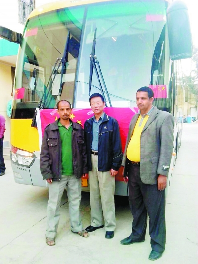 撤离也门时,中国驻也门大使馆参赞胡要武在挂着五星红旗的大客车前与也门当地人合影。