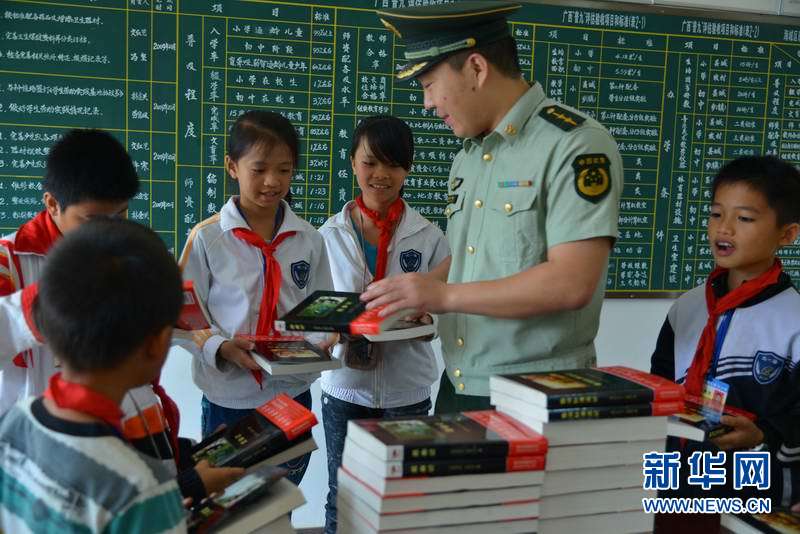 官兵向孩子们发放图书