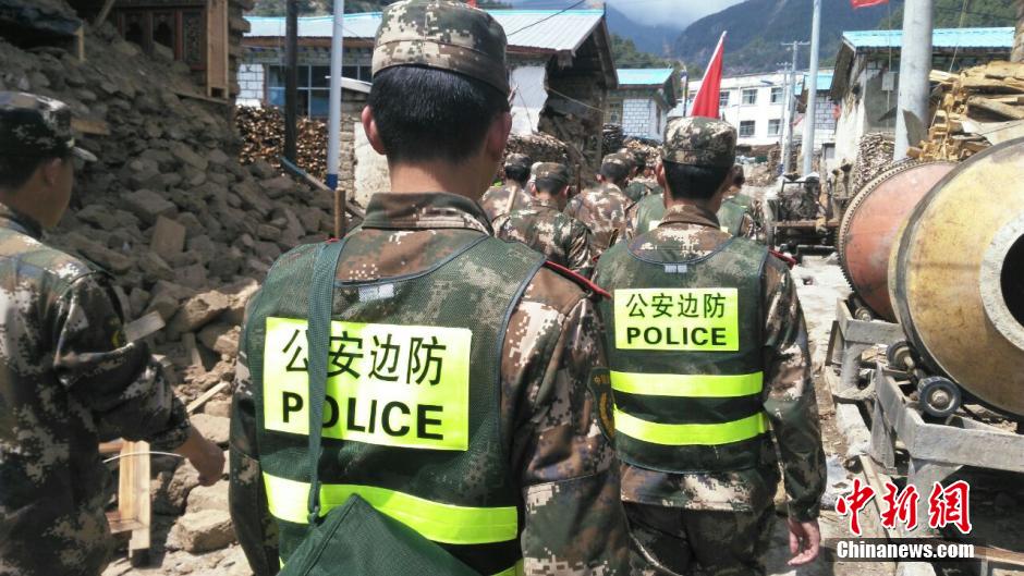 4月26日,西藏日喀则吉隆边防检查站的战士们在地毯式搜救吉隆村委会居民。中新社发 李国伟 摄