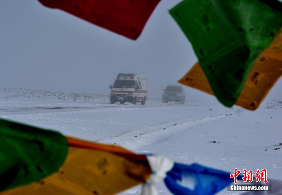 4月26日,养路工人正在路面抛洒融雪盐。目前前往西藏日喀则吉隆、聂拉木灾区的国道318线(中尼公路)由于降雪,嘉措拉山路段道路积雪结冰,救援队伍前进缓慢。 中新社发 李林 摄