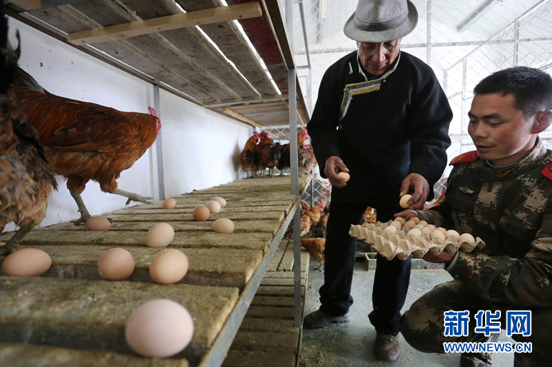 官兵与藏族群众在土鸡养殖场收集土鸡蛋