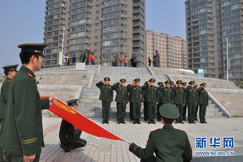 官兵在鸭绿江浮桥遗址处向团旗宣誓