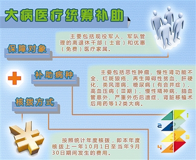 2004年5月14日,总参谋部、总政治部、总后勤部联合下发《军人及其家属医疗费用管理规定》,开始实行大病医疗统筹补助经费制度;2012年2月19日,总后勤部财务部、卫生部下发《关于进一步加强军人及优惠医疗家属大病医疗统筹补助经费管理的通知》,其中指出,大病医疗统筹补助是对军人和享受优惠医疗的家属,患大病出院后,其后续治疗应当由基层医疗门诊机构保障,在合理医疗范围内,单位自身经费保障仍然困难的,由上级单位给予统筹补助;2014年7月23日,总后勤部下发《军队公务事业费标准》,重新对大病医疗统筹补助经费管理及核拨方式进行了明确。