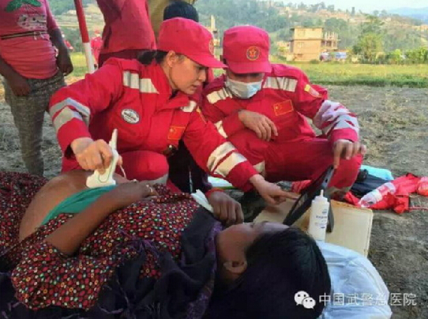4月30日清晨,加德满都的北部天空朝霞红得像少女的红晕,可是在受灾群众的眼里,此时的太阳却像在挑着重担艰难地向上攀爬。一位年轻的尼泊尔孕妇脚步是那么急促,说着让中国国际救援队队员听不懂的话语,看神情明显是来找中国医生求助的。
