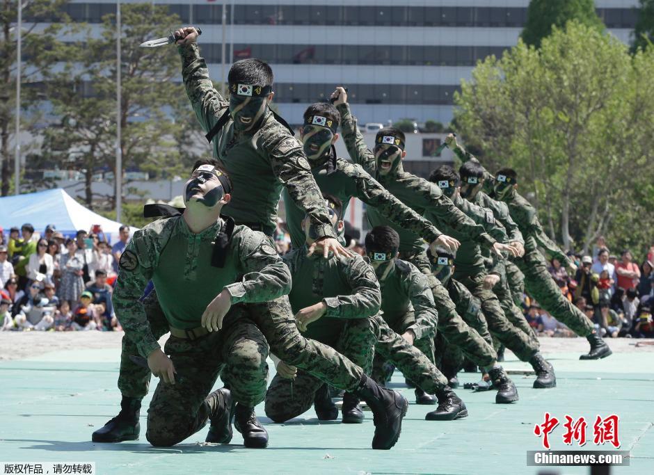 当地时间2015年5月5日,韩国首尔,韩国陆军特种部队的士兵在儿童节当天在战争博物馆前展示技能。
