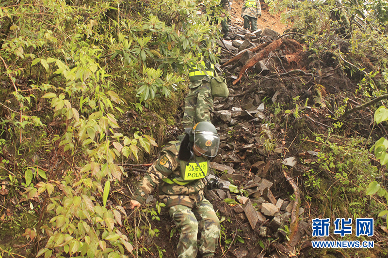 从立新村通往雪布岗村仅有的一条弹石小路由于受地震影响,山体塌方、滚石坠落,多处被巨石阻挡,部分路段被泥土、沙石掩埋。救援官兵冒着余震、泥石流、山体滑坡重重危险,踏上了从立新村通往雪布岗村的5公里未知险途……余震不时袭来,大地剧烈晃动,巨大的石块随时从山上滚落,稍有不慎,就有可能被石头砸中。衣服湿透了,肩肿了,脚磨破了,双腿发酸、发软,官兵们没有一个喊苦喊累,没有一个退缩。面对如此艰难的困境,大家心中想只有受灾群众的安危。快点!再快点!!!一小时后,救援官兵终于抵达雪布岗村,成为第一支到达雪布岗村的救援力量。