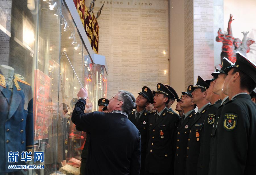 5月6日,在俄罗斯首都莫斯科,中国人民解放军三军仪仗队官兵在授勋仪式后参观莫斯科中央军事博物馆。俄罗斯国防部6日在莫斯科授予参加红场阅兵的中国仪仗兵纪念勋章。112名中国人民解放军三军仪仗队官兵将于9日参加纪念卫国战争胜利70周年红场阅兵。新华社记者贾宇辰摄 图片来源:新华网