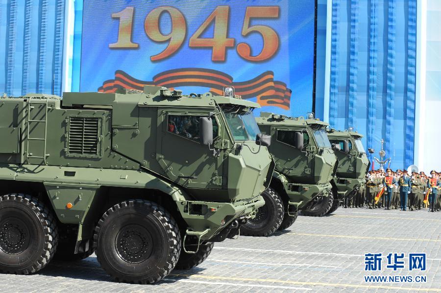 5月7日,在俄罗斯首都莫斯科,“台风-K”多功能装甲车在彩排中列队前进。当日,俄罗斯在首都莫斯科的红场举行纪念卫国战争胜利70周年红场阅兵式总彩排。 新华社记者 戴天放 摄