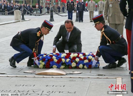 8日上午,奥朗德首先向位于香榭丽舍大道上的戴高乐将军铜像鲜花,随后在共和国卫队骑兵护卫下来到凯旋门广场,为无名烈士墓拨亮长明火,敬献红白蓝三色花圈。他还在政府总理瓦尔斯和国防部长勒德里昂陪同下检阅三军仪仗队,并接见老兵代表。仪式上奏法国国歌《马赛曲》和法国抵抗运动歌曲——《游击队之歌》。