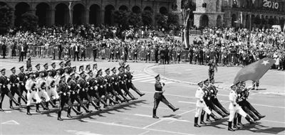 2010年9月16日,我三军仪仗方队高擎五星红旗,通过墨西哥宪法广场。孟宪华摄(资料图片)