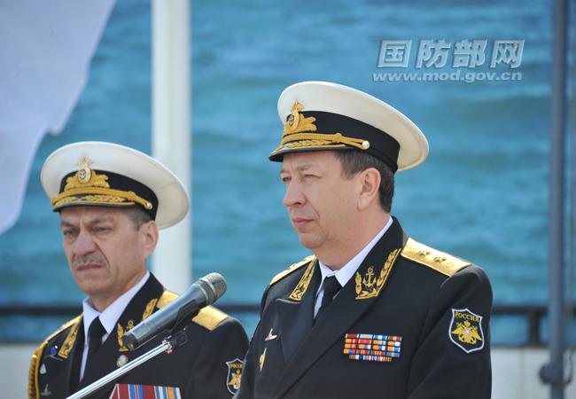 中俄“海上联合-2015(Ⅰ)”军事演习中方总导演、中国海军副司令员杜景臣海军中将和俄方总导演、俄海军副司令费多坚科夫海军中将共同宣布演习开始。图为俄方总导演、俄海军副司令费多坚科夫海军中将。李靖摄