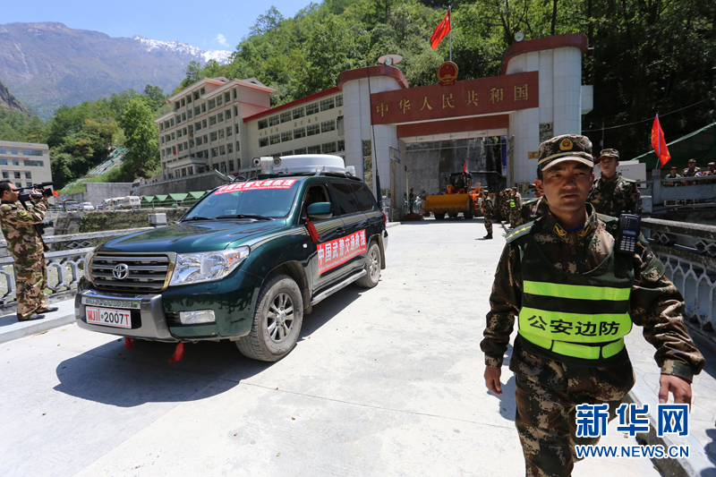 尼玛云旦带领中国武警交通部队救援队通过中尼友谊桥前往尼泊尔救援
