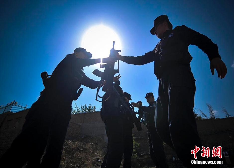 5月13日,新疆乌鲁木齐市公安局特警八支队六大队的特警队员在该市市郊的射击靶场进行警用枪械实弹射击考核。