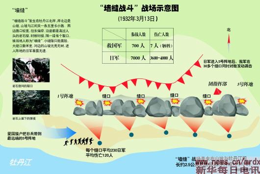 “墙缝”是夹在牡丹江和一个山坡中间的一条5华里长小路,路边耸立一人多高的石壁,时断时续,隔一段有个裂口,被称“墙缝”。小的缝隙只能露脸,大的缝口数米宽。埋伏两端可形成交叉火力。