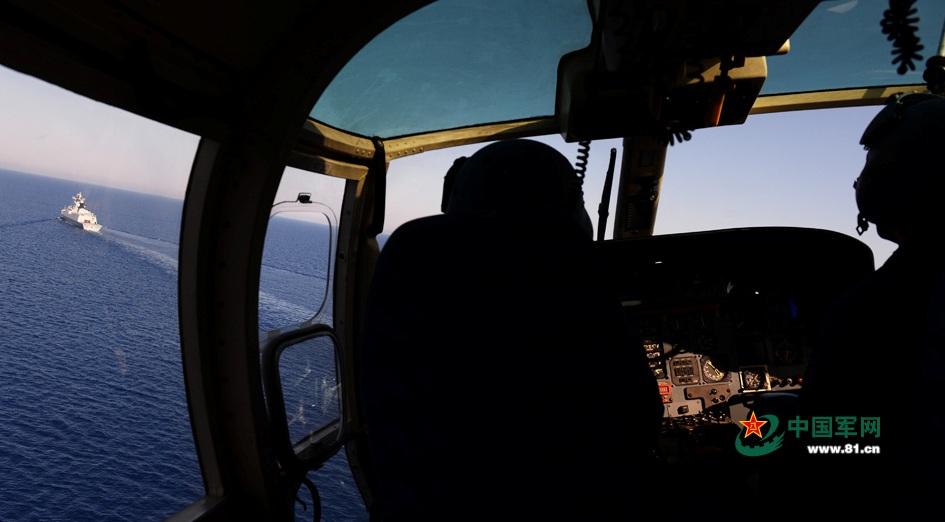 当地时间下午2时30分,临沂舰接海上联合集群指挥所命令,舰载直升机升空模拟敌空袭兵力……记者获准登机拍摄了海上联合集群航行中的镜头。(来源:中国军网 中国军网记者李靖摄影报道)