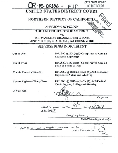 起诉书中罗列了关于这些指控的各项“证据”,这6人共面临32项指控,包括共谋从事经济间谍活动、共谋盗窃商业机密、经济间谍及教唆以及盗窃商业机密及教唆。