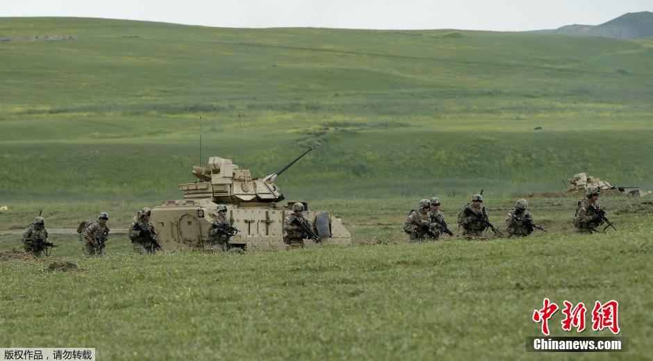 当地时间2015年5月21日,格鲁吉亚首都第比利斯附近的军事基地,美国和格鲁吉亚军队进行代号为“高贵伙伴”联合军事演习。图为“布雷德利”步兵战车参与演习。