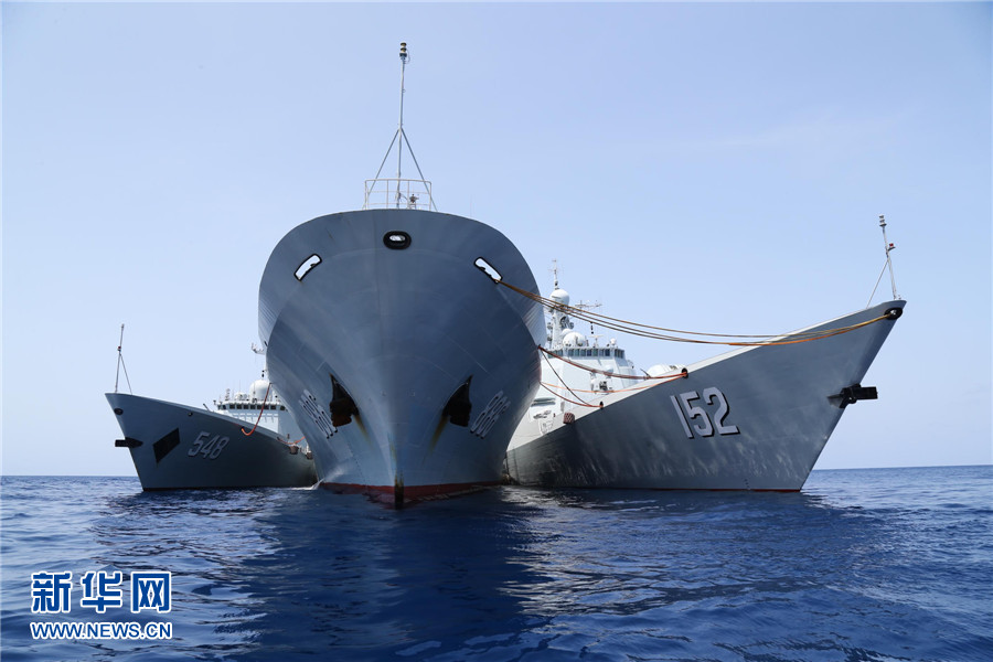 海军第二十批护航编队济南舰、益阳舰、千岛湖舰三舰在亚丁湾西部海域并靠补给。 代宗锋摄
