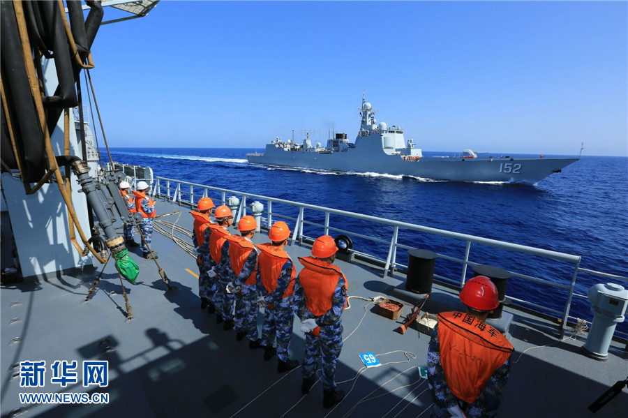 海面上,济南舰开始加速,占领千岛湖舰左舷补给阵位。很快,两舰保持规定间距同向同速航行。