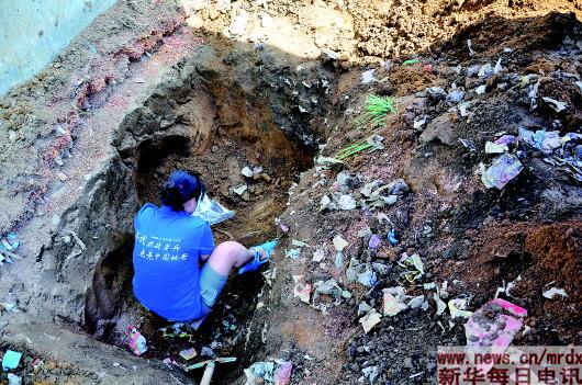 图为一名工作者在一处沦为垃圾填埋池的缅甸远征军墓地搜寻英烈的遗骸。