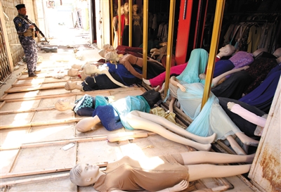 提克里特 伊拉克军队4月夺回提克里特,图为伊拉克警察驻守在提克里特人去楼空的商店前。