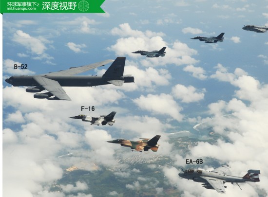美国空军的大型编队,聚集了B-52轰炸机、F-16战斗机和EA-6B电子战机3种机型。