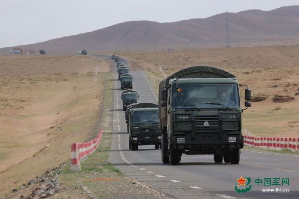 The troops participating in the drill maneuver on their way to the Zhurihe training base in North China's Inner Mongolia Autonomous Region. The Stride 2015•Zhurihe Trans-Military Area Command (MAC) Confrontation Drill of the PLA kicked off at the Zhurihe training base in North China's Inner Mongolia Autonomous Region on the afternoon of June 1, 2015. A mixed brigade from the PLA Nanjing MAC maneuvered thousands of kilometers to the training base to conduct the realistic confrontation drill with the PLA's first professional simulated enemy--"Blue Army". (Chinamil.com.cn/ Wang Jiayin)