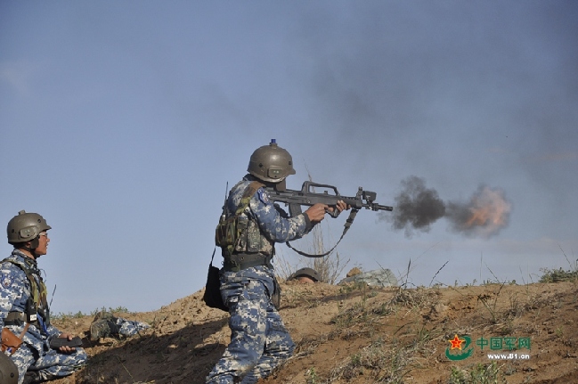 蓝军战士对敌射击。