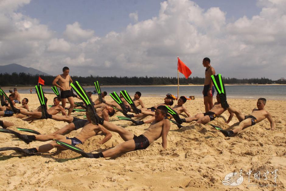 中国空降兵海滩赤膊练体能 亮出一身肌肉