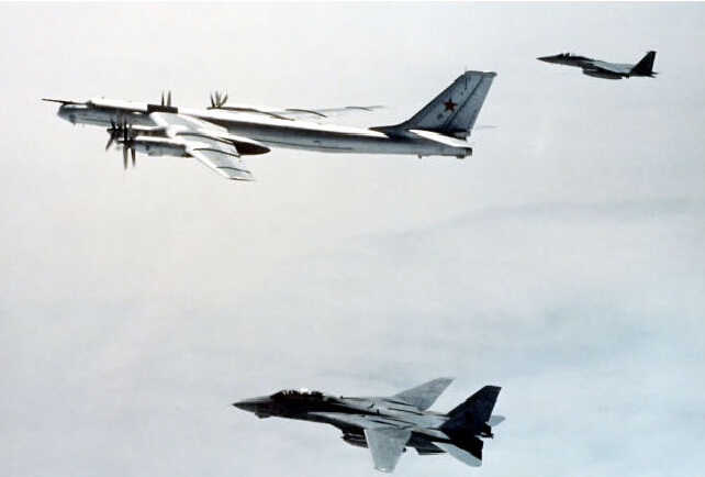 1987年5月29日,一架在西北太平洋上空飞行的苏联空军图—95轰炸机,受到了美国海军F—14战斗机和美国空军F—15战斗机的“夹道欢迎”。
