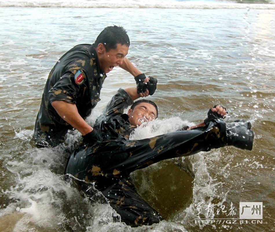 三亚警备区充分利用海岛滩涂资源,开展极限体能训练,锻造官兵敢打必胜信心。图为两栖侦察兵海中进行格斗训练。
