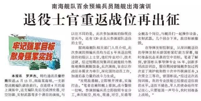 相关报道中,还让优秀退役士官“出镜”了:在导弹发射控制室,从深圳舰退役的导弹发射兵曾国彬紧盯前方屏幕,随时准备抗击来袭的空中目标。笔者了解到,曾国彬从事导弹专业16年,创新多项战法训法,服役期间曾随舰参加过两次亚丁湾护航和数十次中外联演任务,3次荣立三等功。曾国彬说:“经过这次返岗训练,我的专业技能已经接近退伍前的水平。退伍不褪色,军人的使命始终牢记在心,只要祖国一声号令,我时刻准备上战场。”